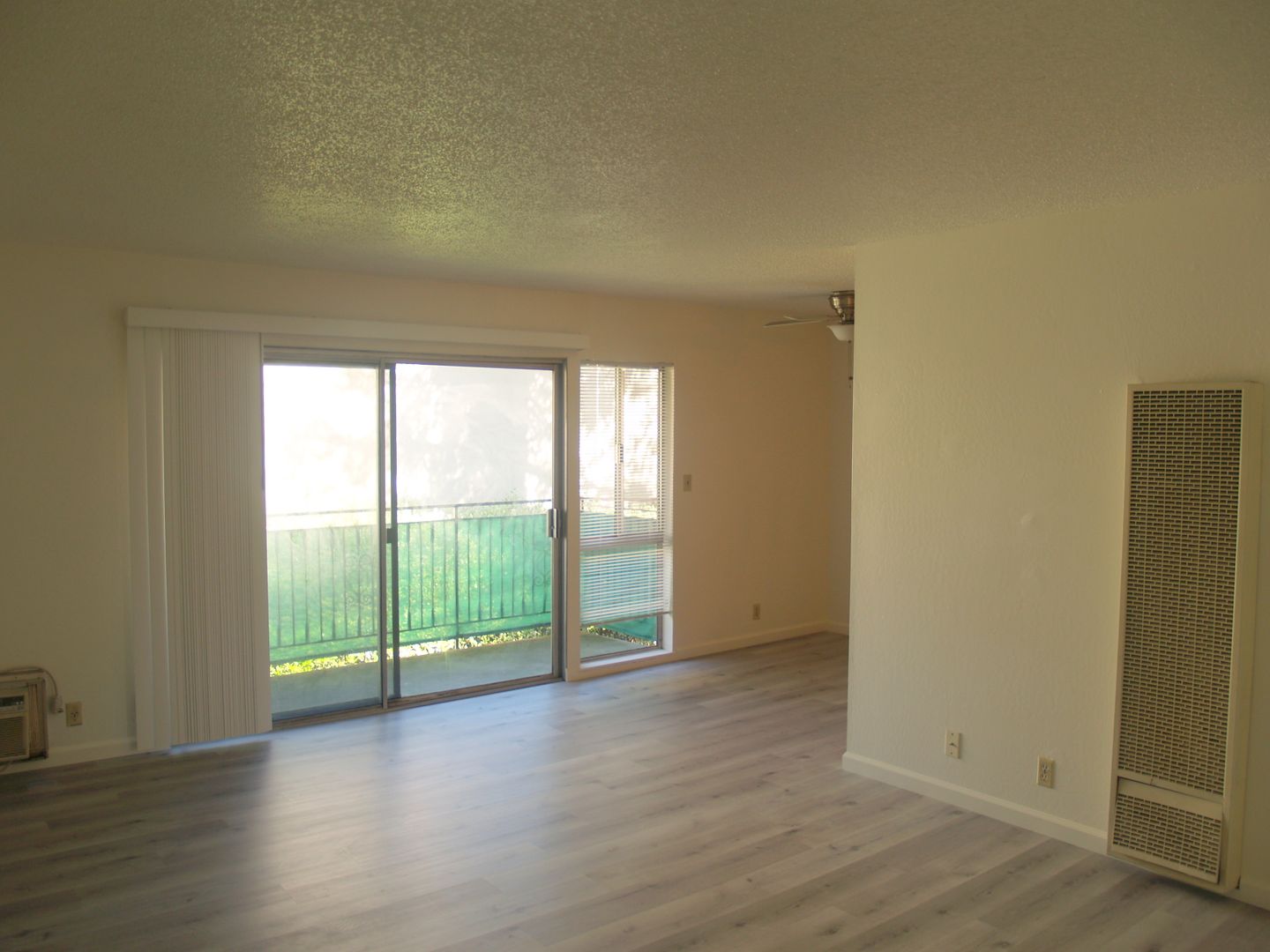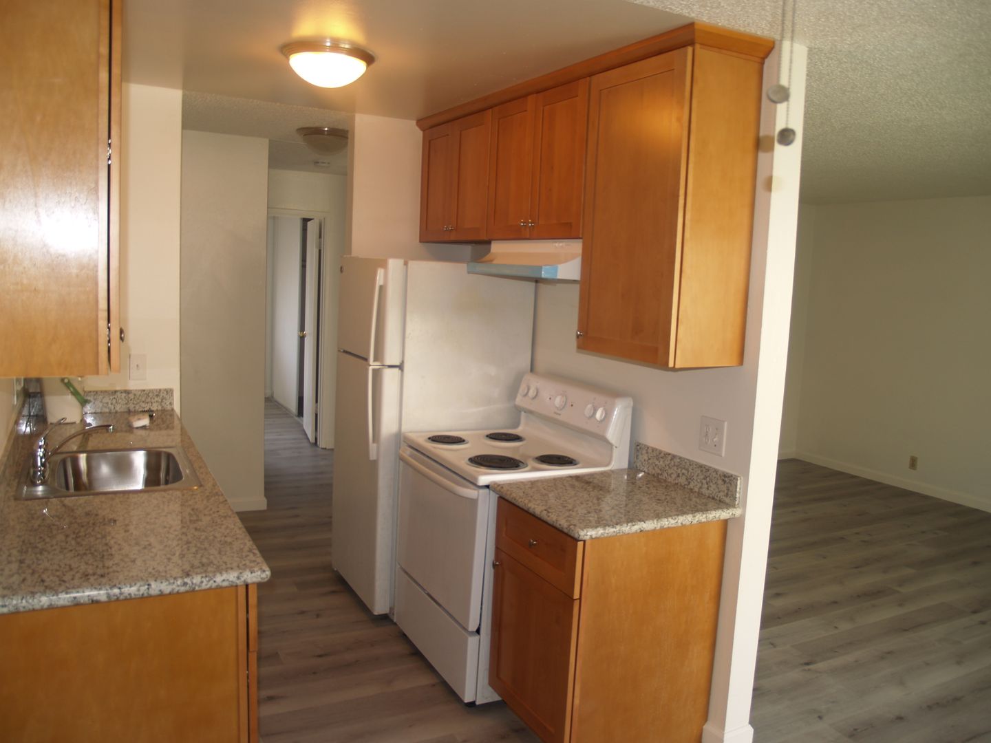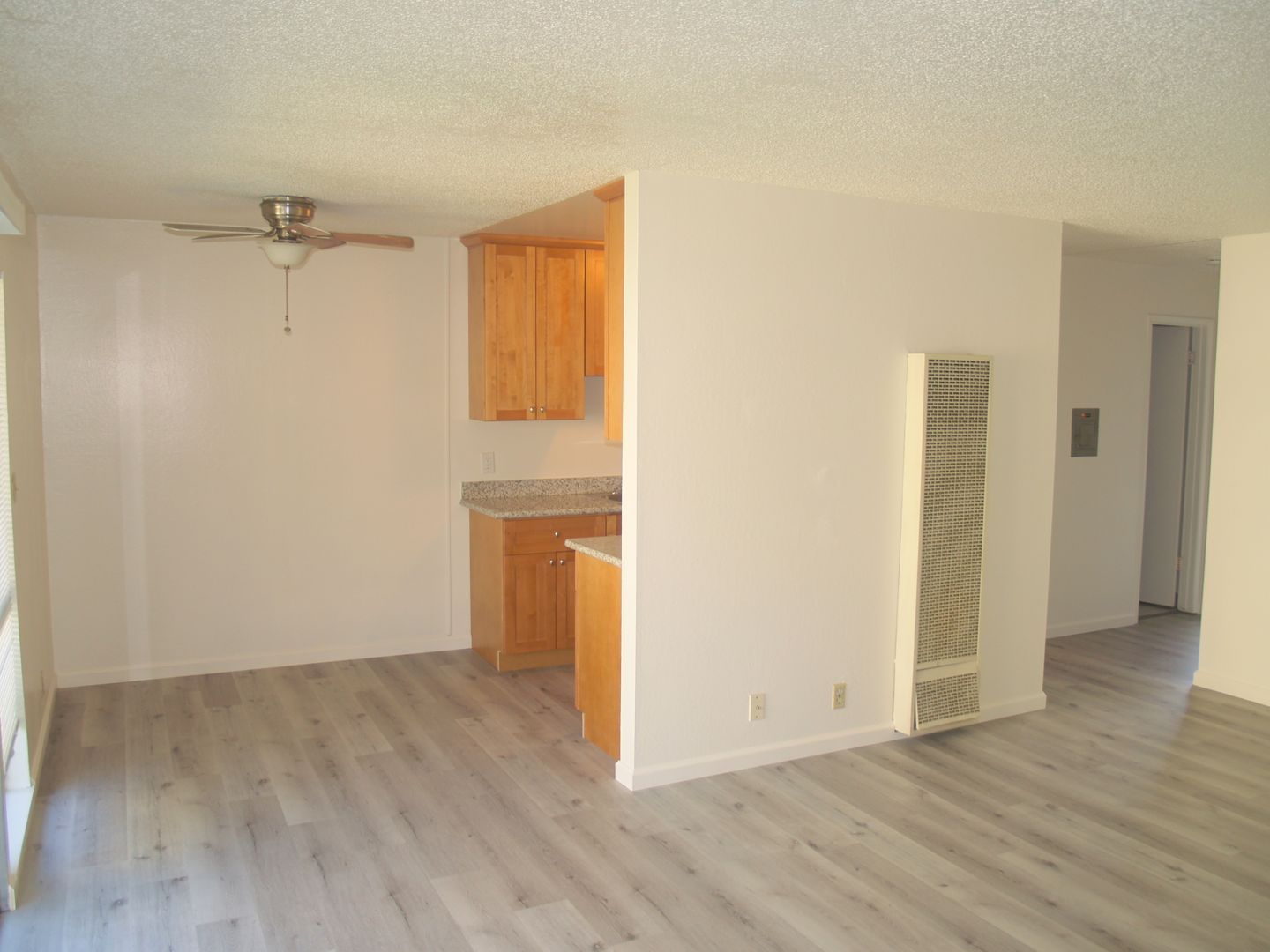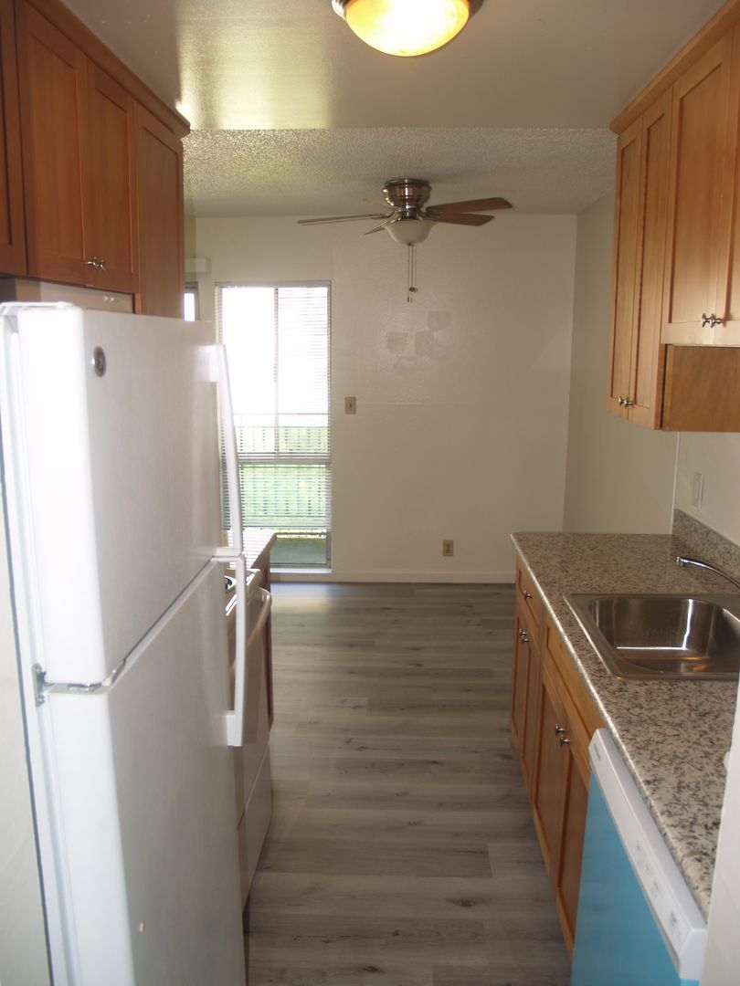 Bright and sunny completely remodeled 2 bedroom 1 bath unit on 2nd floor with living room that has wall A/C, dining room with ceiling fan, laminate flooring, dishwasher, garbage disposal, refrigerator, electric stove, gas wall heater, linen closet in hall, spacious bedroom closets, bathroom, and private patio. Complex features assigned carport, plenty of visitor parking and coin-op laundry room on premises, as well as an onsite manager. Great location right off Amador Valley Blvd. walking distance to shops, restaurants, schools, BART, and easy freeway access!